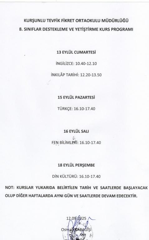 Okulumuzda 2025-2026 Eğitim-Öğretim Yılı için planlanan "Destekleme ve Yetiştirme Kursu (DYK)" programları belli oldu.